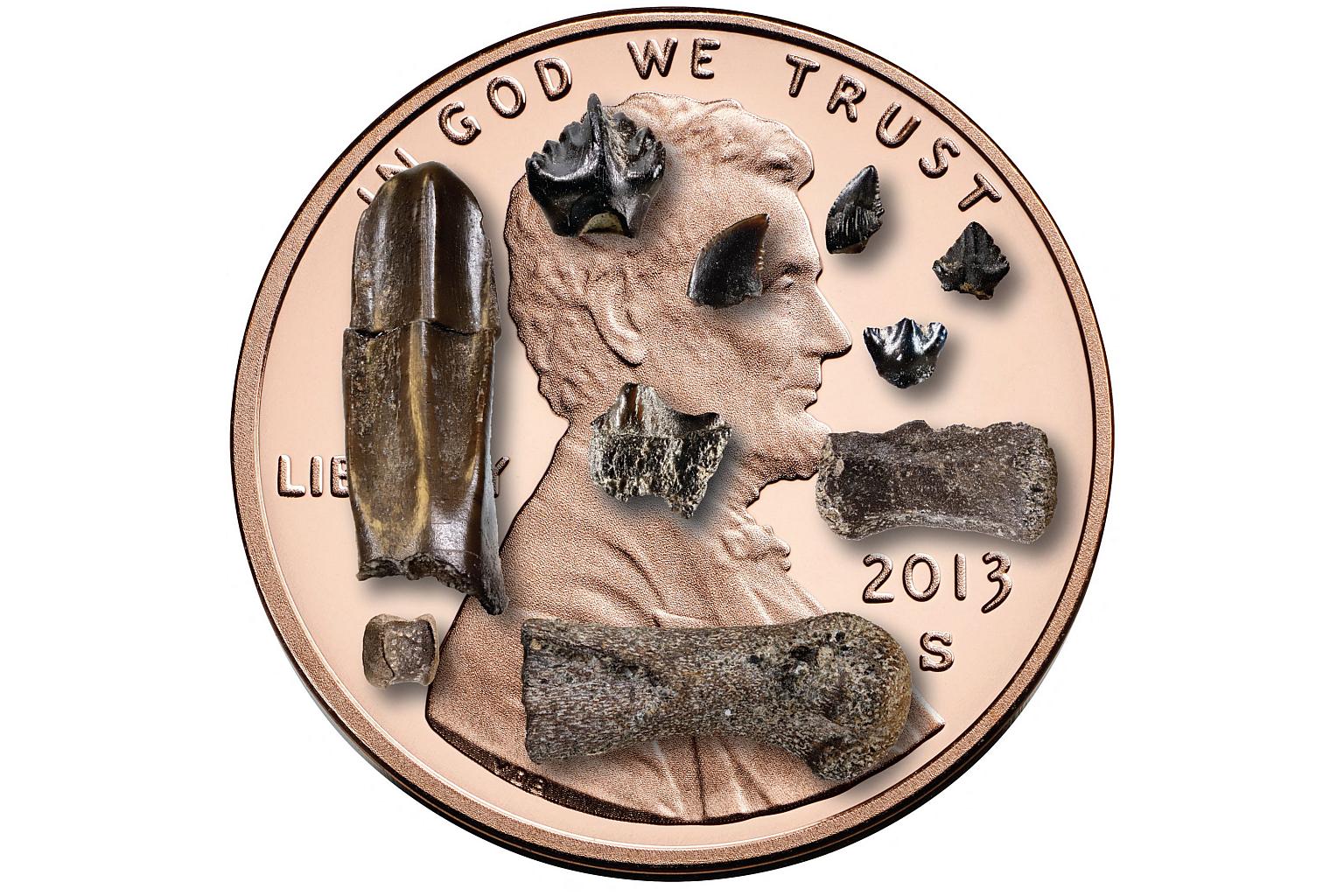 Baby dinosaur bones and teeth that were excavated from the Prince Creek Formation in northern Alaska being displayed on a US penny.