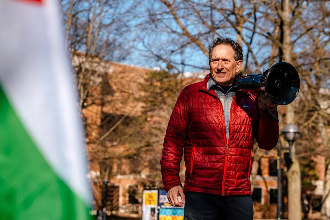 Former representative Andy Levin of Michigan speaking at a rally in Ann Arbor, on Feb 20.