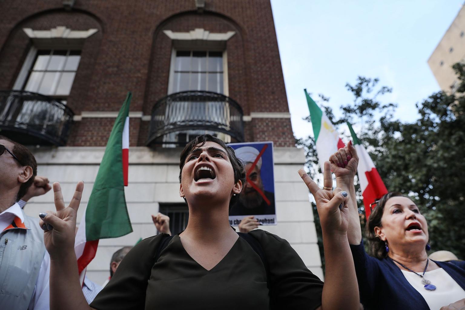 Protesters critical of the Iranian government demonstrate outside of the Council on Foreign Relations.