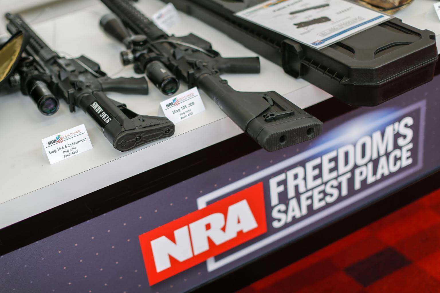 Firearms on display at the National Rifle Association's Annual Meetings at the Georgia World Congress Center in Atlanta, USA, on April 27, 2017. US President Donald Trump will speak at the NRA Leadership Forum on April 28, 2017.