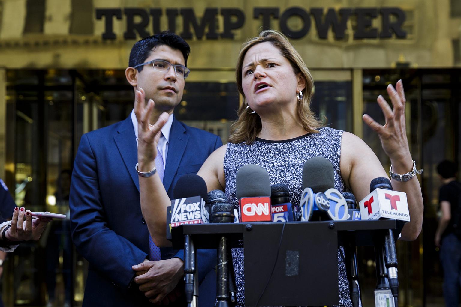 New York City Council Speaker Melissa Mark-Viverito (right) and council member Carlos Menchaca, holding a press conference to denounce republican presidential candidate Donald Trump's attacks against US Judge Gonzalo Curiel, in front of Trump Tower in New York, on June 6.