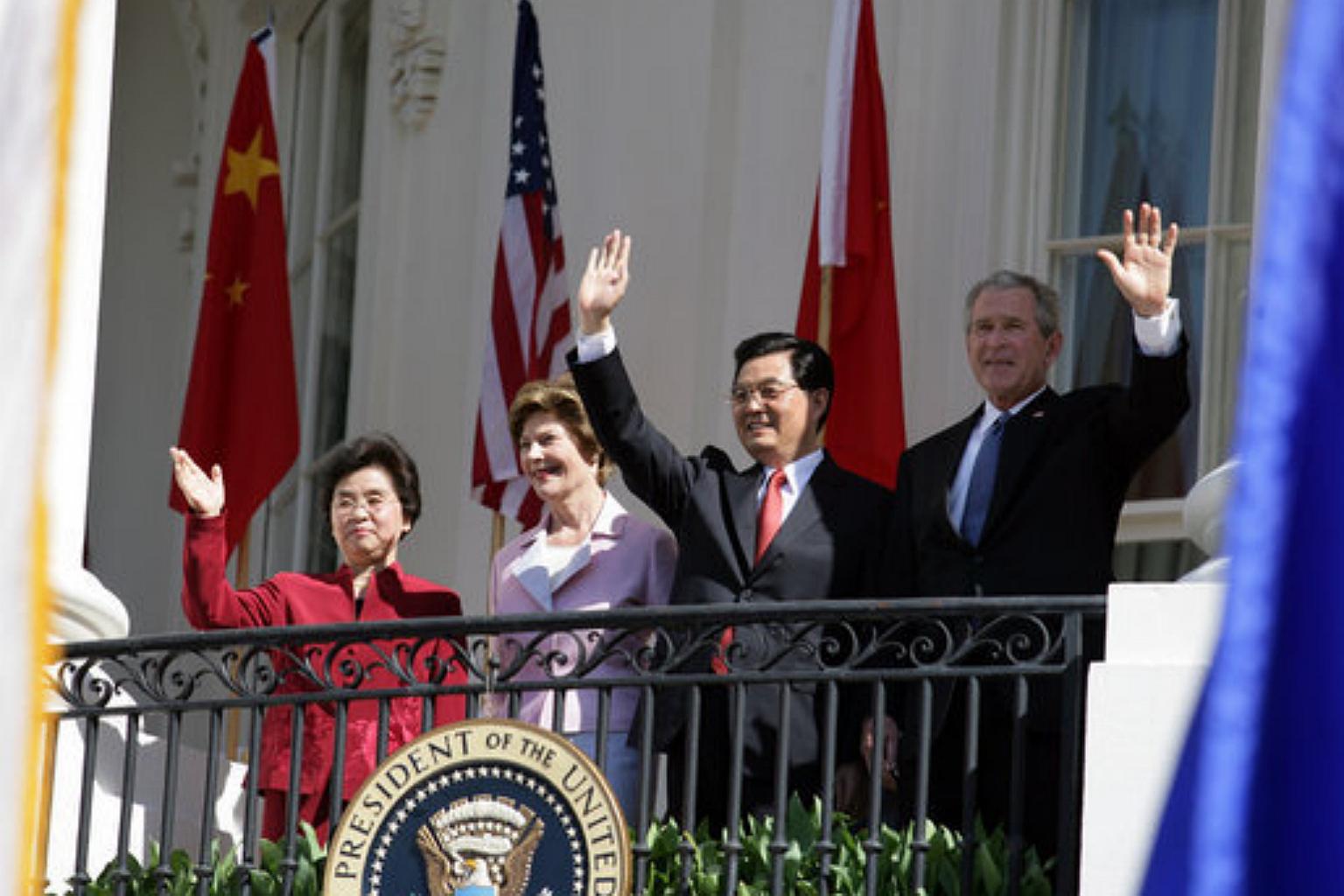 Mr Bush and Mr Hu with their wives, Laura Bush and Liu Yongqing, wave from the White House's South Portico balcony after the arrival ceremony for Mr Hu on April 20, 2006.