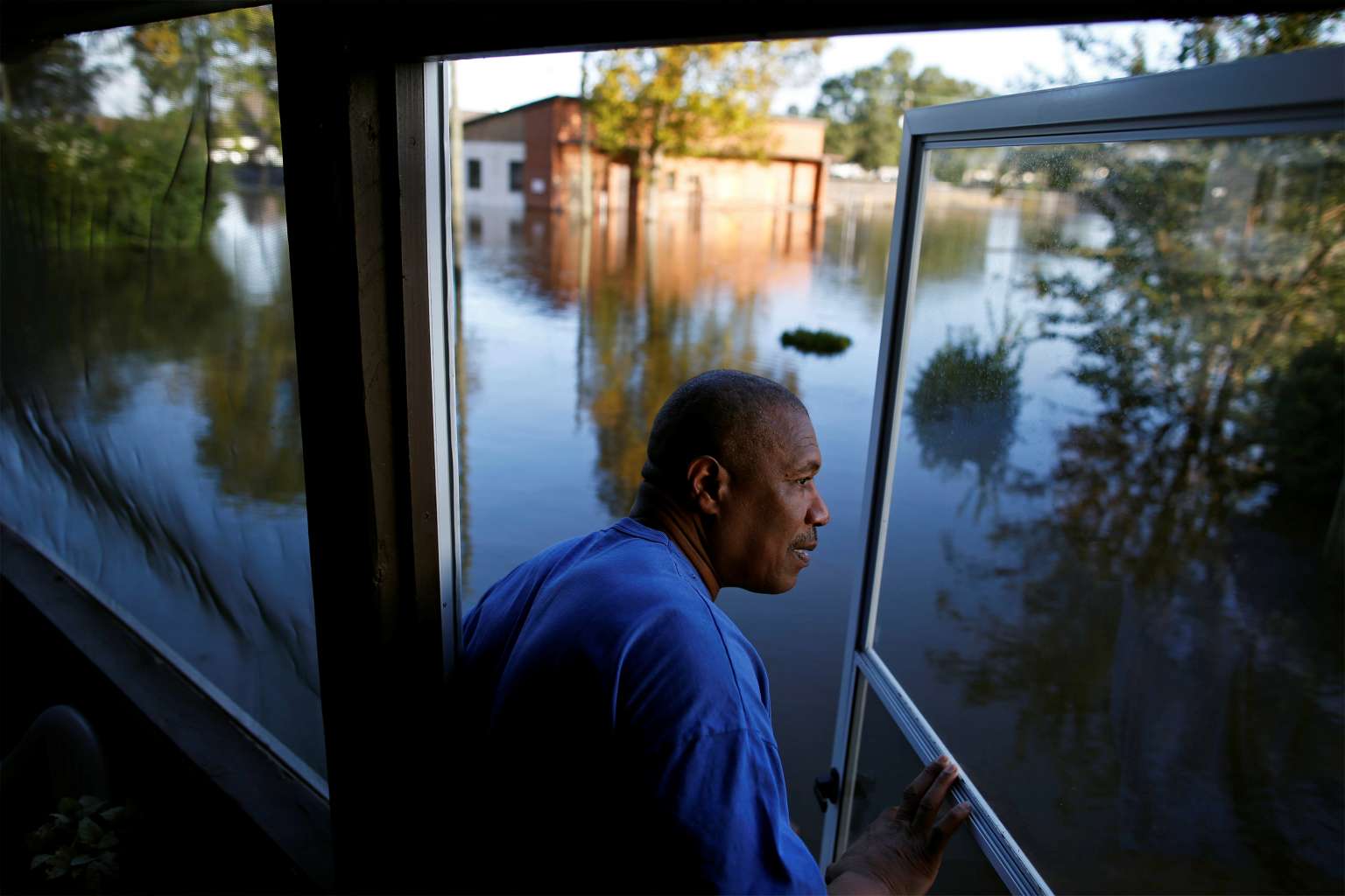 Eric McClary checks on his flooded home after the effects of Hurricane Matthew in Goldsboro, North Carolina.