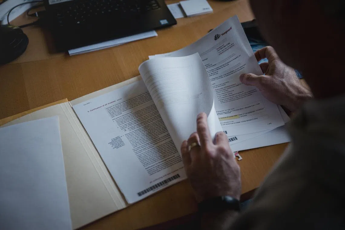 Mr Chris Mancinelli looking through trustee papers at his home in Collegeville.