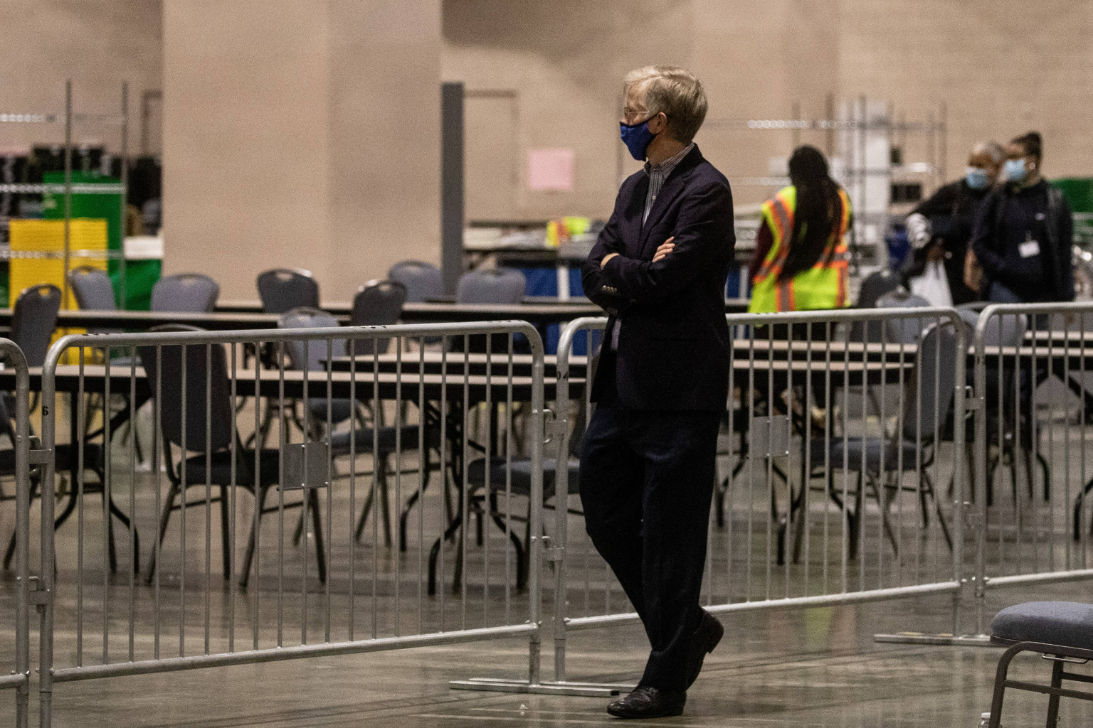 A man watches on from the observers area as election workers count ballots at the Philadelphia Convention Centre on Nov 6, 2020.