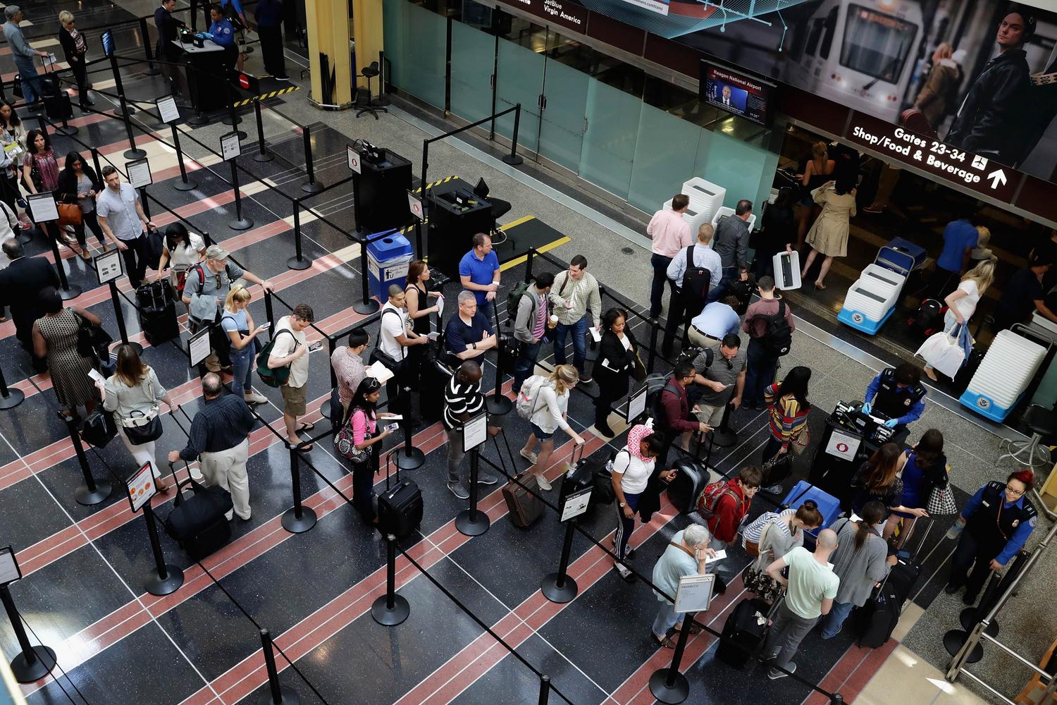 Passengers queue up outside a Transportation Security Administration checkpoint at Ronald Reagan National Airport in Arlington, on May 27, 2016.