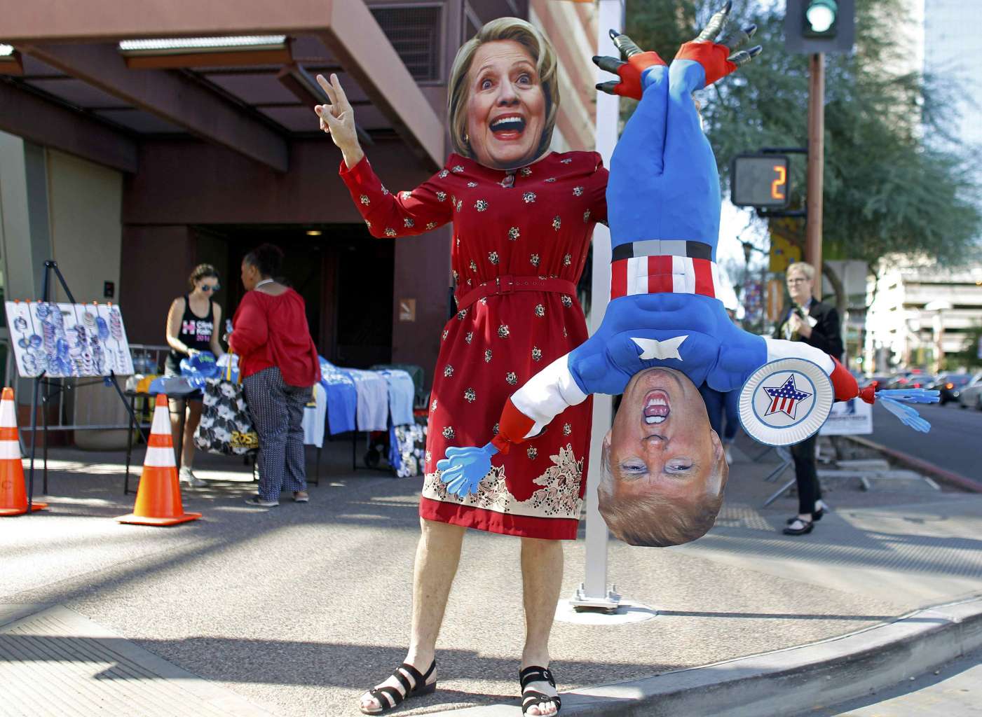 A man wears a mask depicting Clinton while holding a doll depicting her rival, Donald Trump, in Phoenix, Arizona Oct 20, 2016.