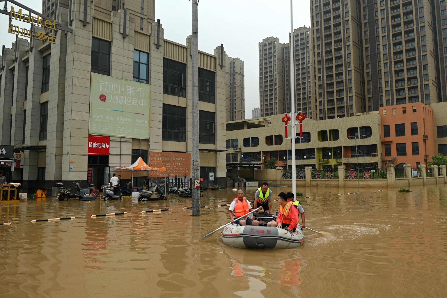 Rescue workers paddling through a flooded street following heavy rain in Zhengzhou in China's Henan province on July 23, 2021.