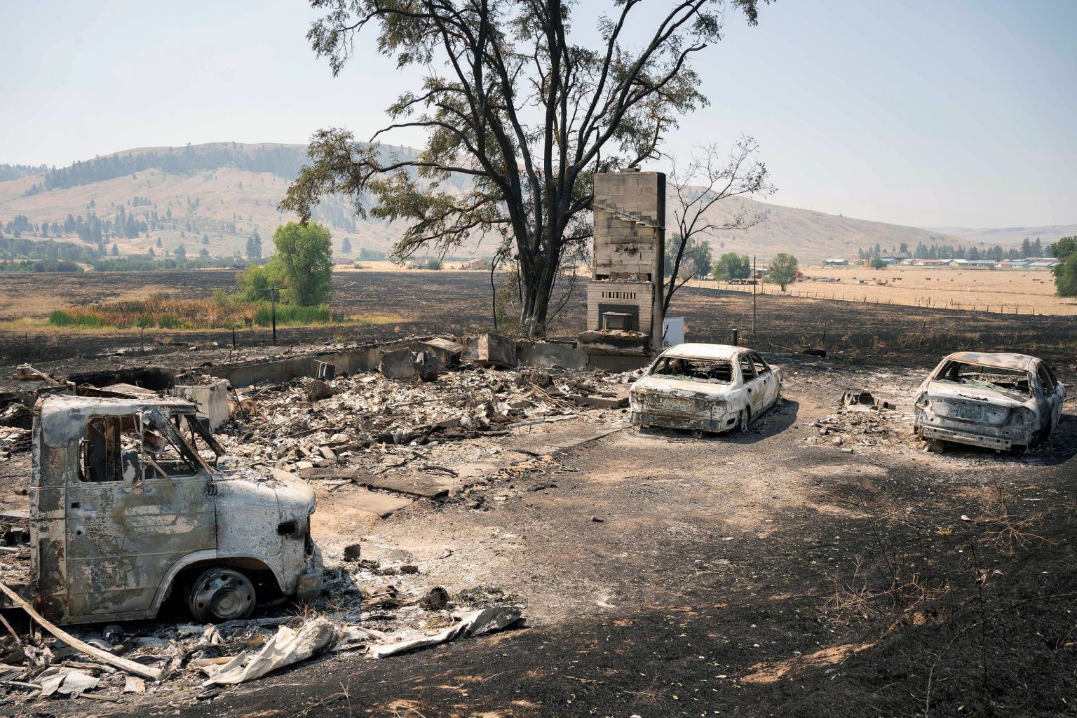 Burned vehicles sit outside a home destroyed by the Chuweah Creek Fire as wildfires devastate Nespelem in eastern Washington state, on July 15, 2021.