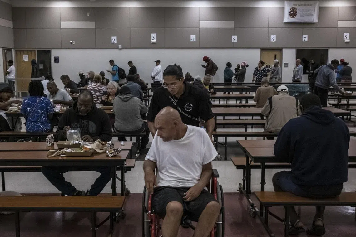 People getting help in a cafeteria of a school turned into a shelter during Hurricane Milton in Orlando, Florida, on Oct 9.