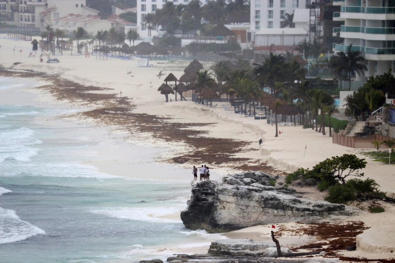 Tourists stand on a rock as subtropical storm Alberto approaches Cancun, Mexico, on May 25, 2018.