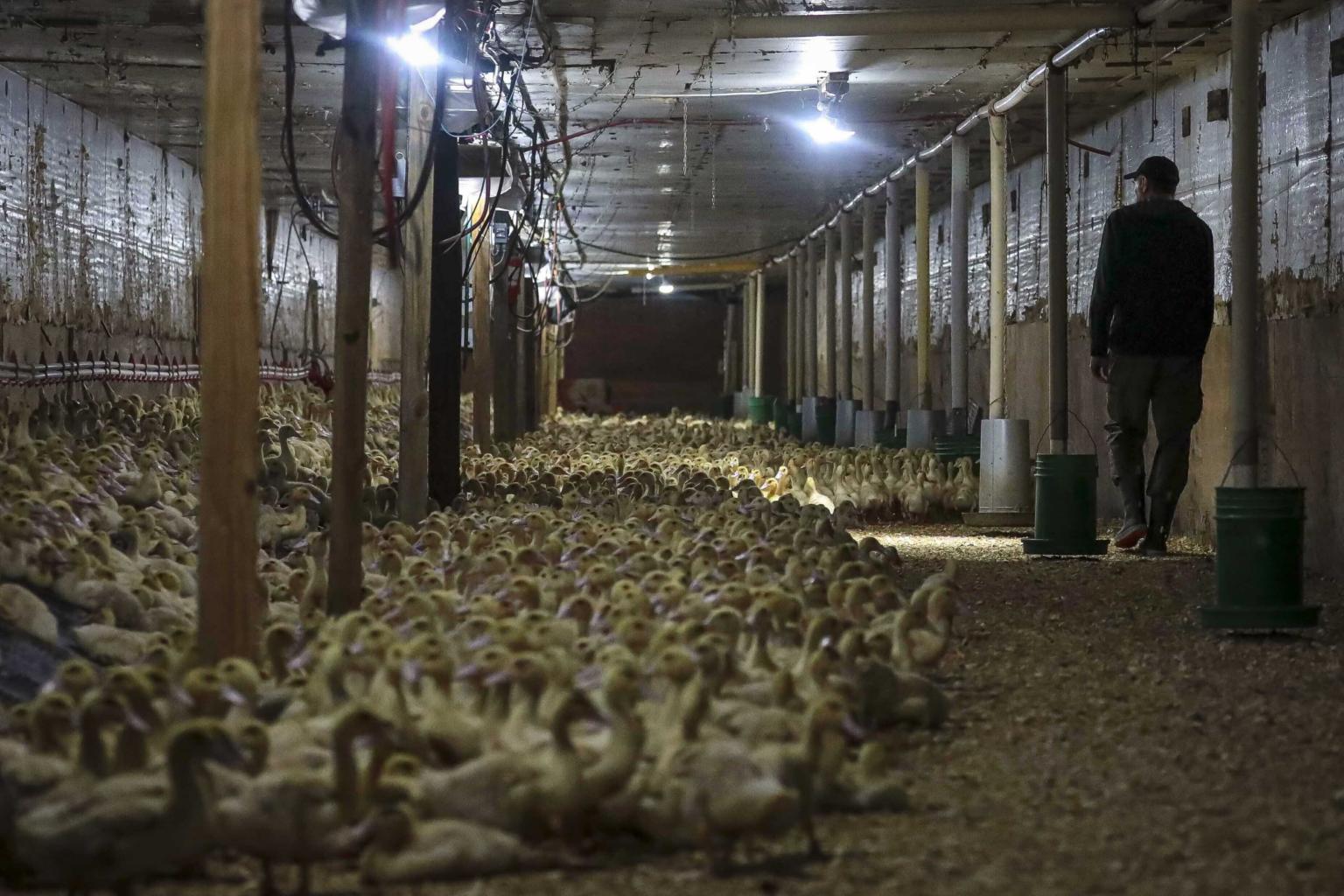 In a photo from July 18, 2019, Mr Marcus Henley, operations manager for Hudson Valley Foie Gras duck farm, tours a barn containing eight-week-old Moulard ducks at the farm in Ferndale, New York.