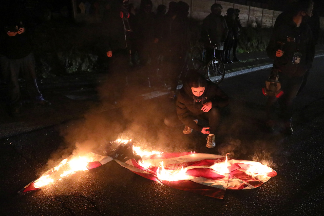 A demonstrator burns a US flag during a protest in Portland, Oregon, on Oct 29, 2020.