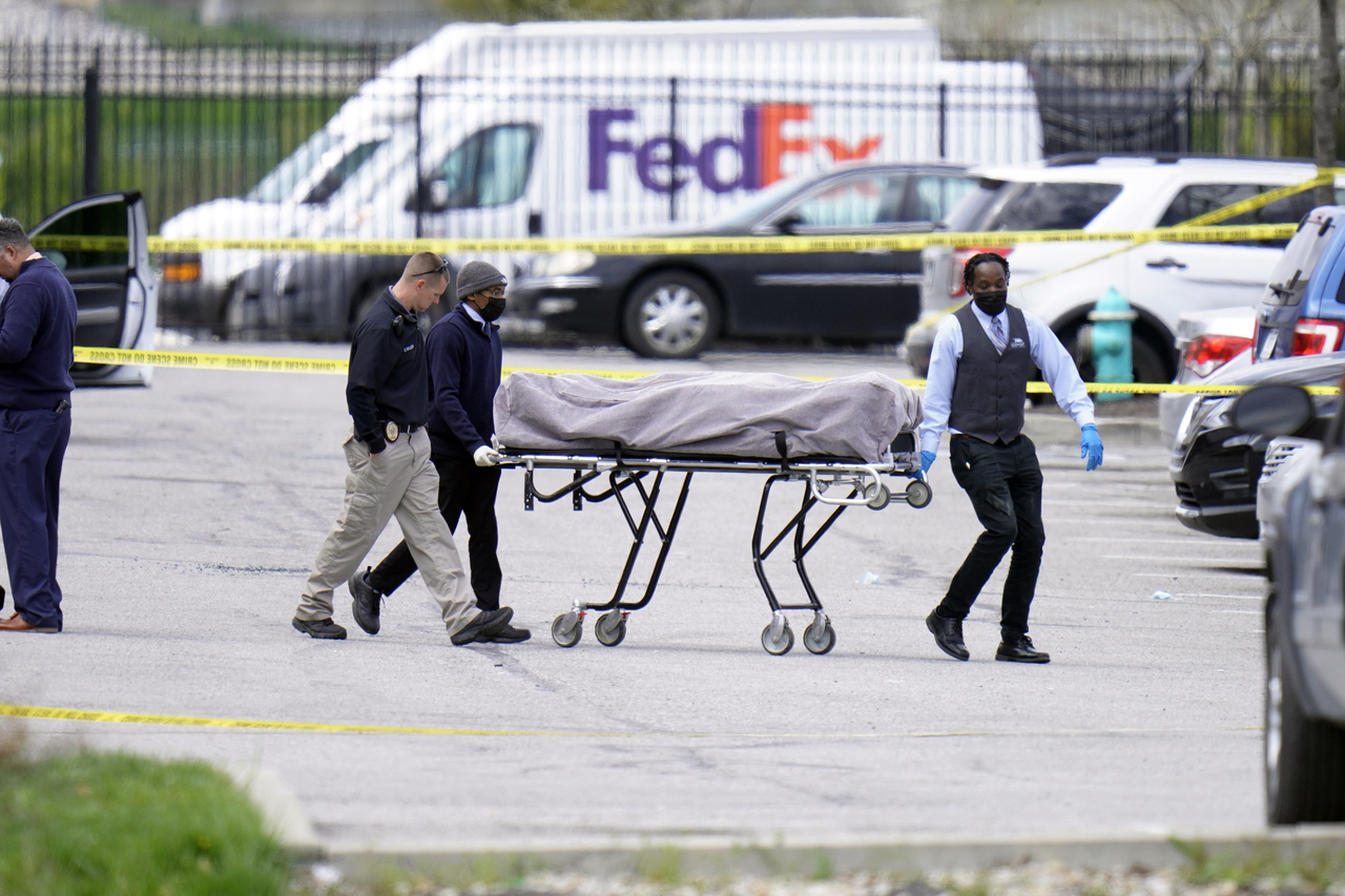 <p>A body is transported from a Fedex facility in Indianapolis on Friday, April 16, 2021, where a mass shooting occurred Thursday night. Eight people were killed and at least seven others were injured in a shooting at the FedEx warehouse in Indianapolis late Thursday, and the gunman was believed to have killed himself, the police said. (A J Mast/The New York Times)</p>