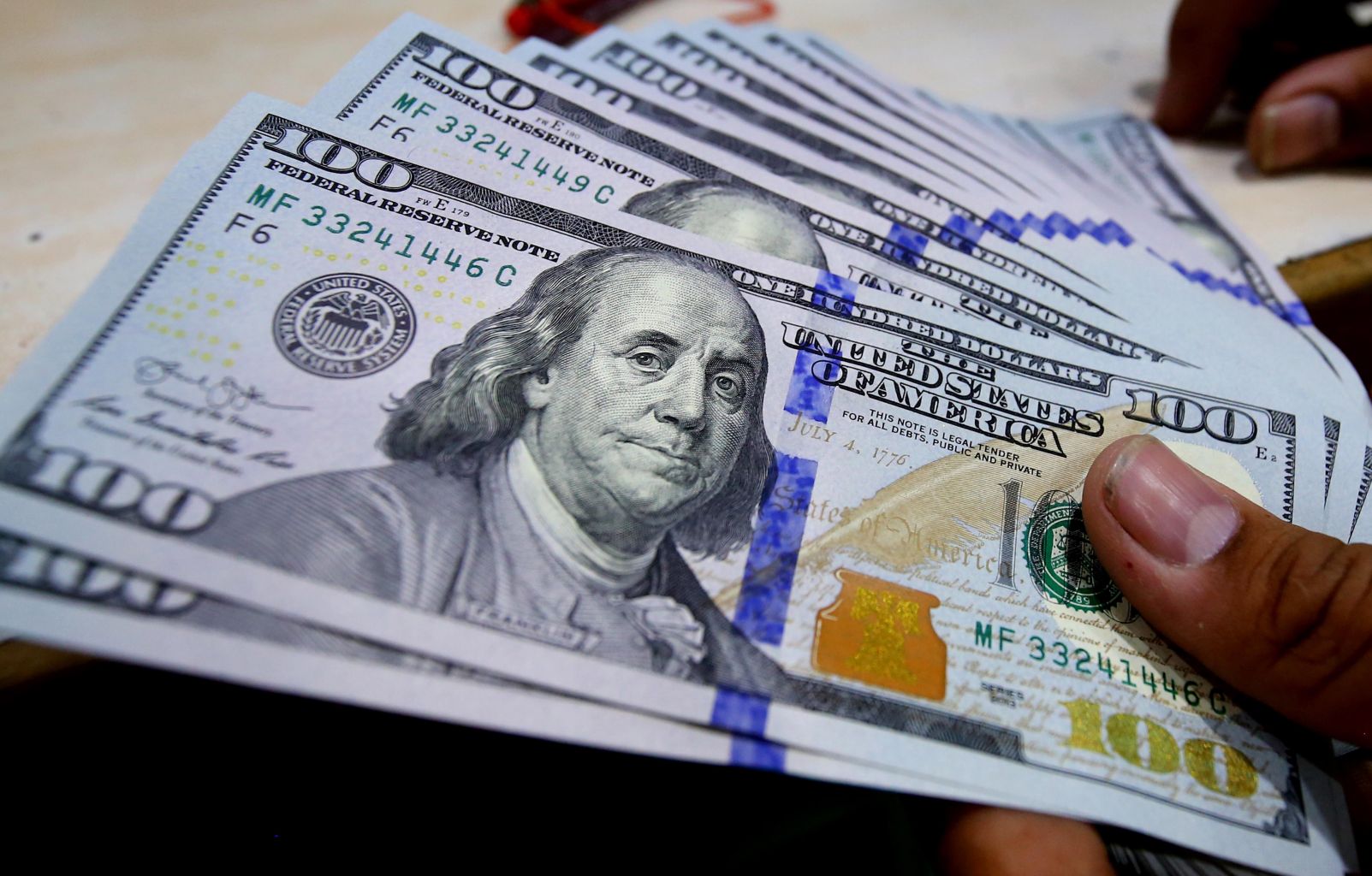 A currency exchange dealer shows US dollar banknotes in Karachi, Pakistan.