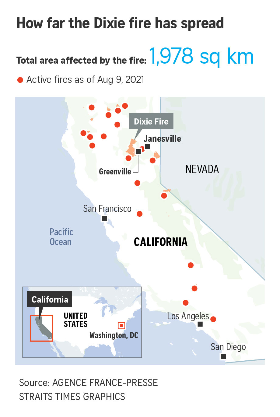 CALIFORNIA (BLOOMBERG) - Hot, dry weather is hampering California firefighters' efforts to combat the Dixie blaze, which swelled over the weekend to become the second-largest in state history and is threatening to engulf a second town.