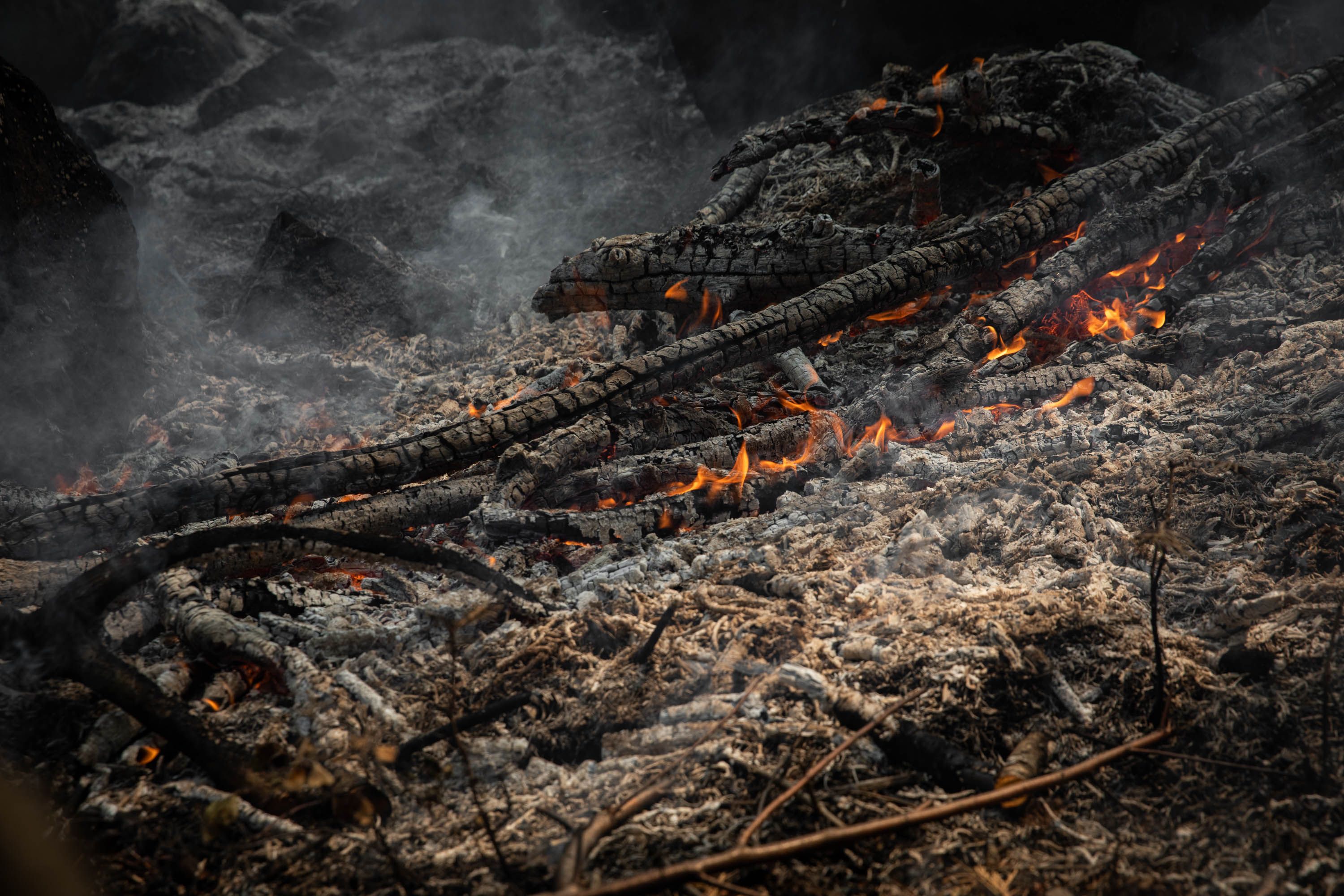 Stumps and logs continue to smolder and burn weeks after the Dixie fire swept through the area in Greenville, California, on Aug 8, 2021.