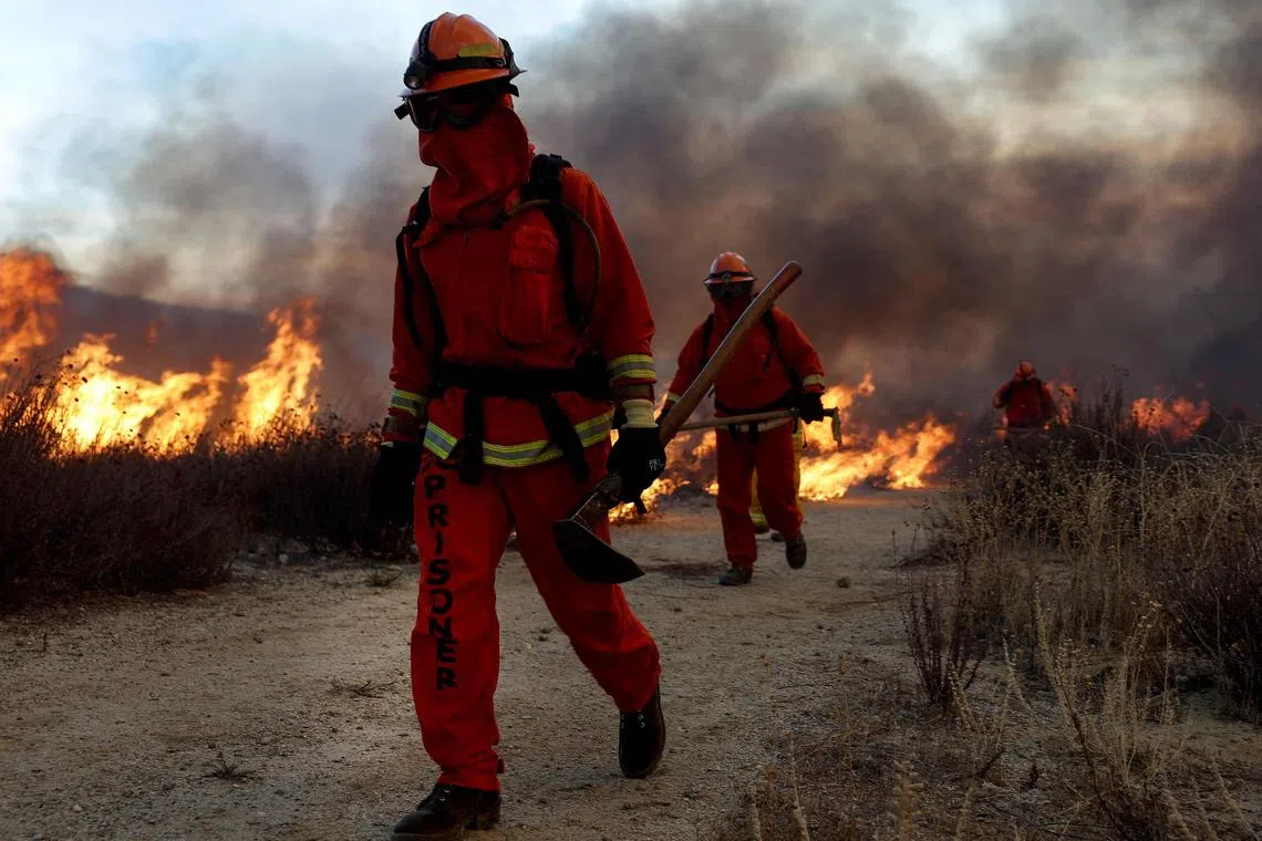 Inmate firefighters at work as the Hughes fire burned north of Los Angeles on Jan 22.