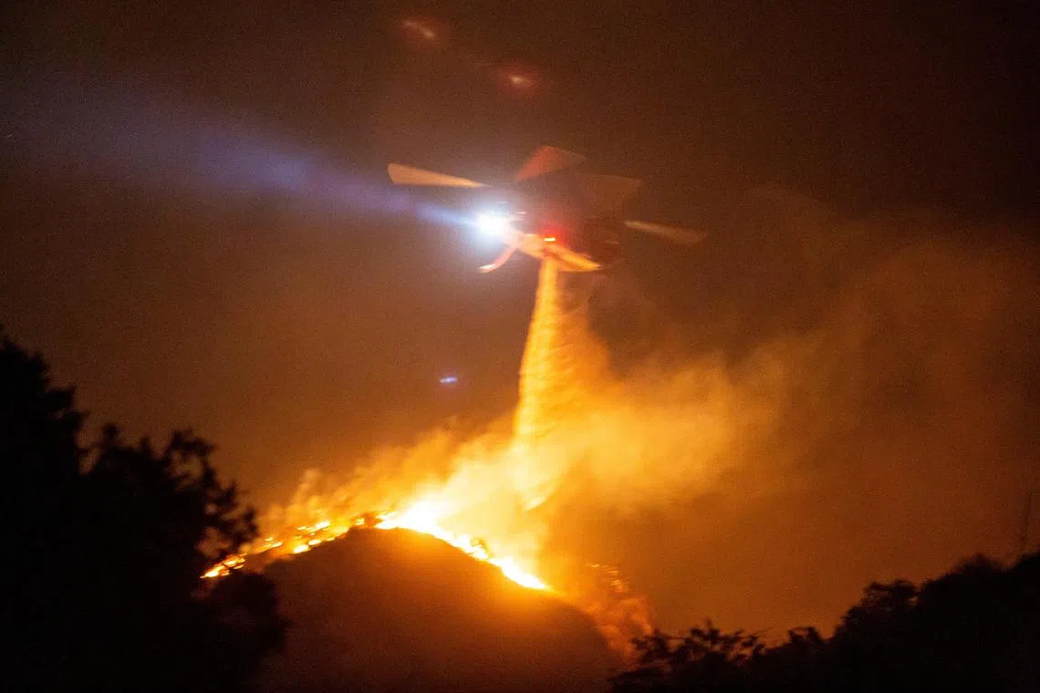 A helicopter dropping water as the Hughes fire burned near Castaic Lake, north of Santa Clarita, California, on Jan 22.
