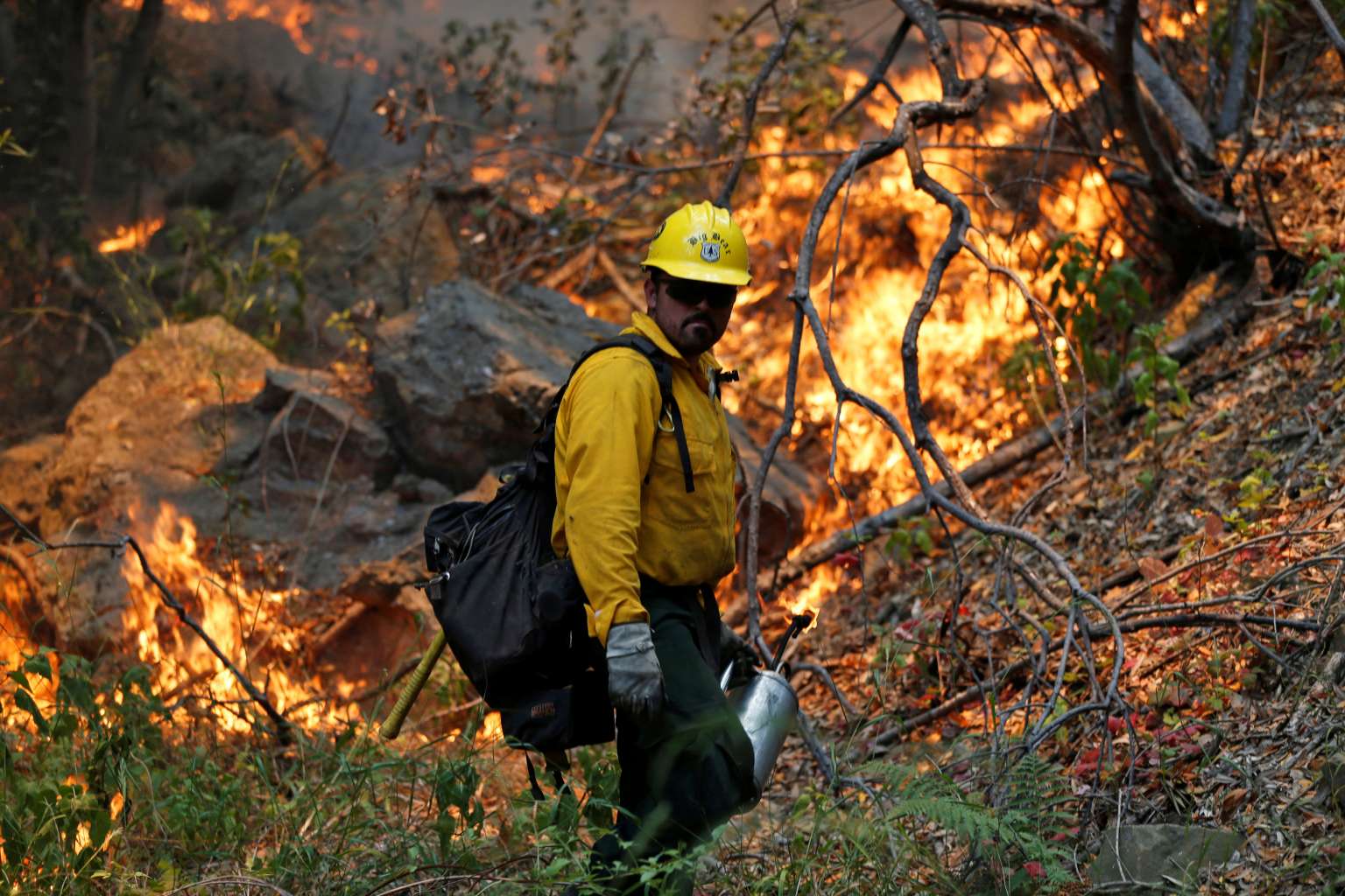 A firefighter battling a blaze in the hills near Goleta, California, on June 16.