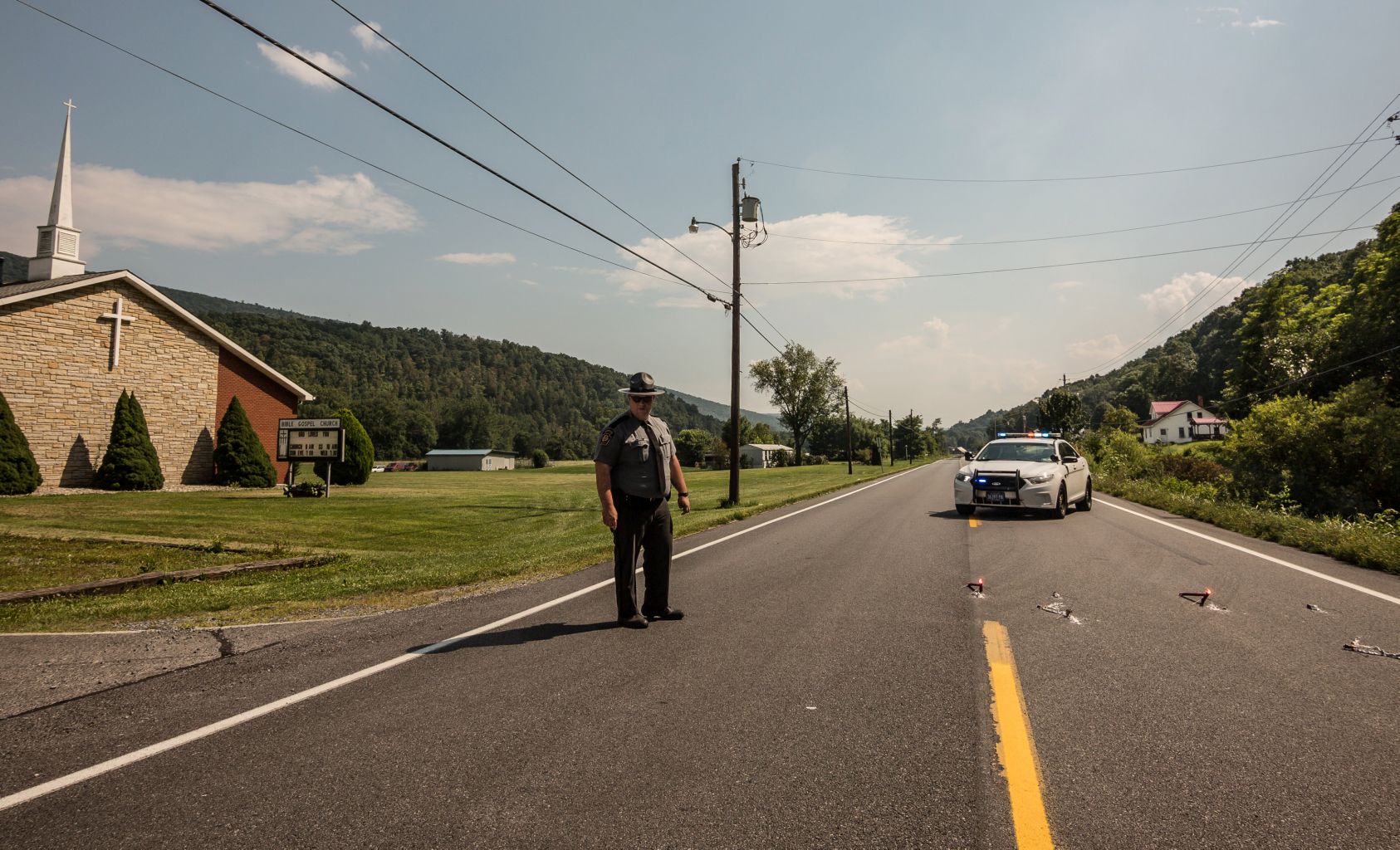 A Pennsylvania State Trooper restricts access to an area where a CSX Corp freight train carrying flammable materials derailed as it moved through Hyndman, Pennsylvania, US, Aug 2, 2017.