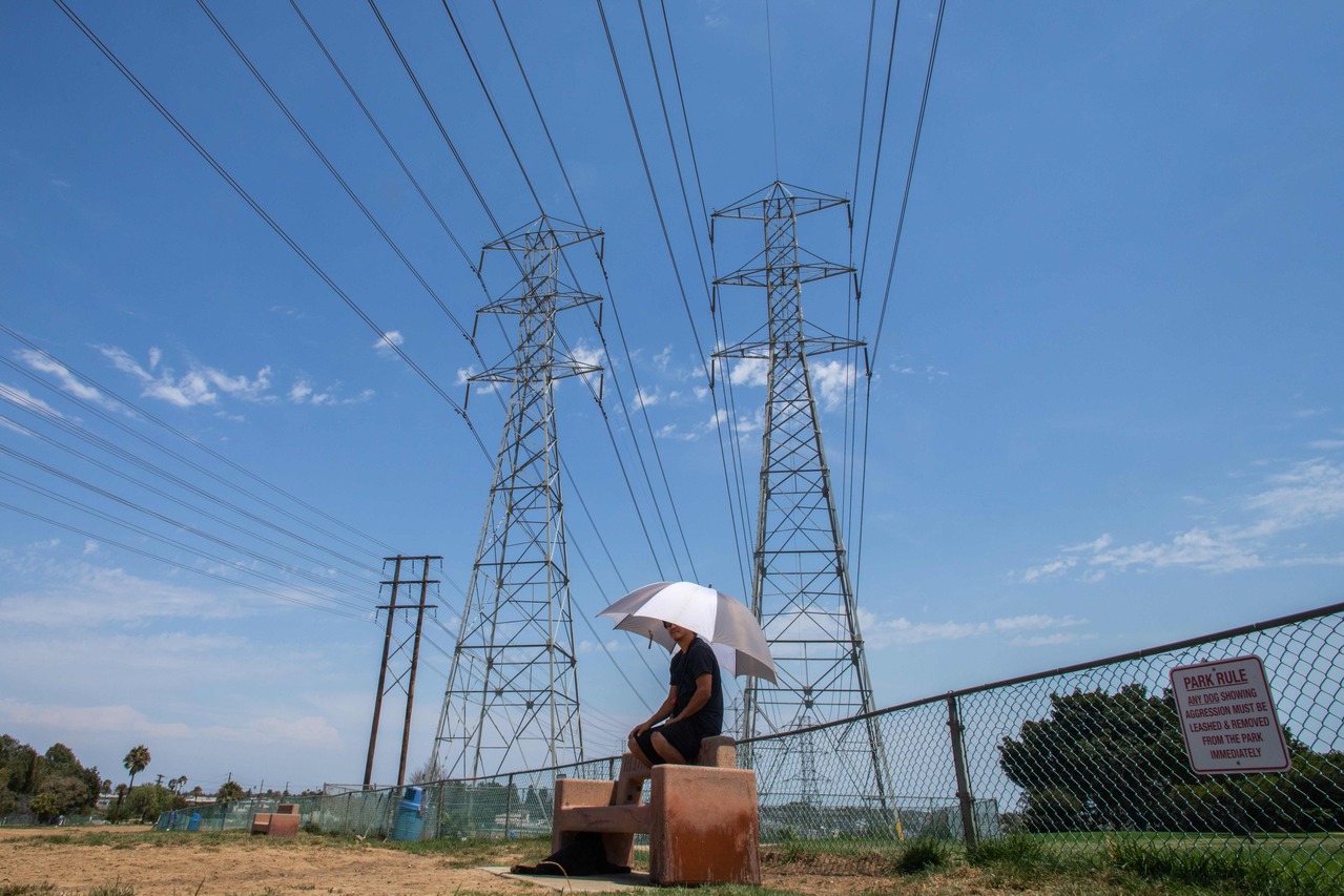 A man sits in the shade of his umbrella under power lines in Redondo Beach, California, on Aug 16, 2020.