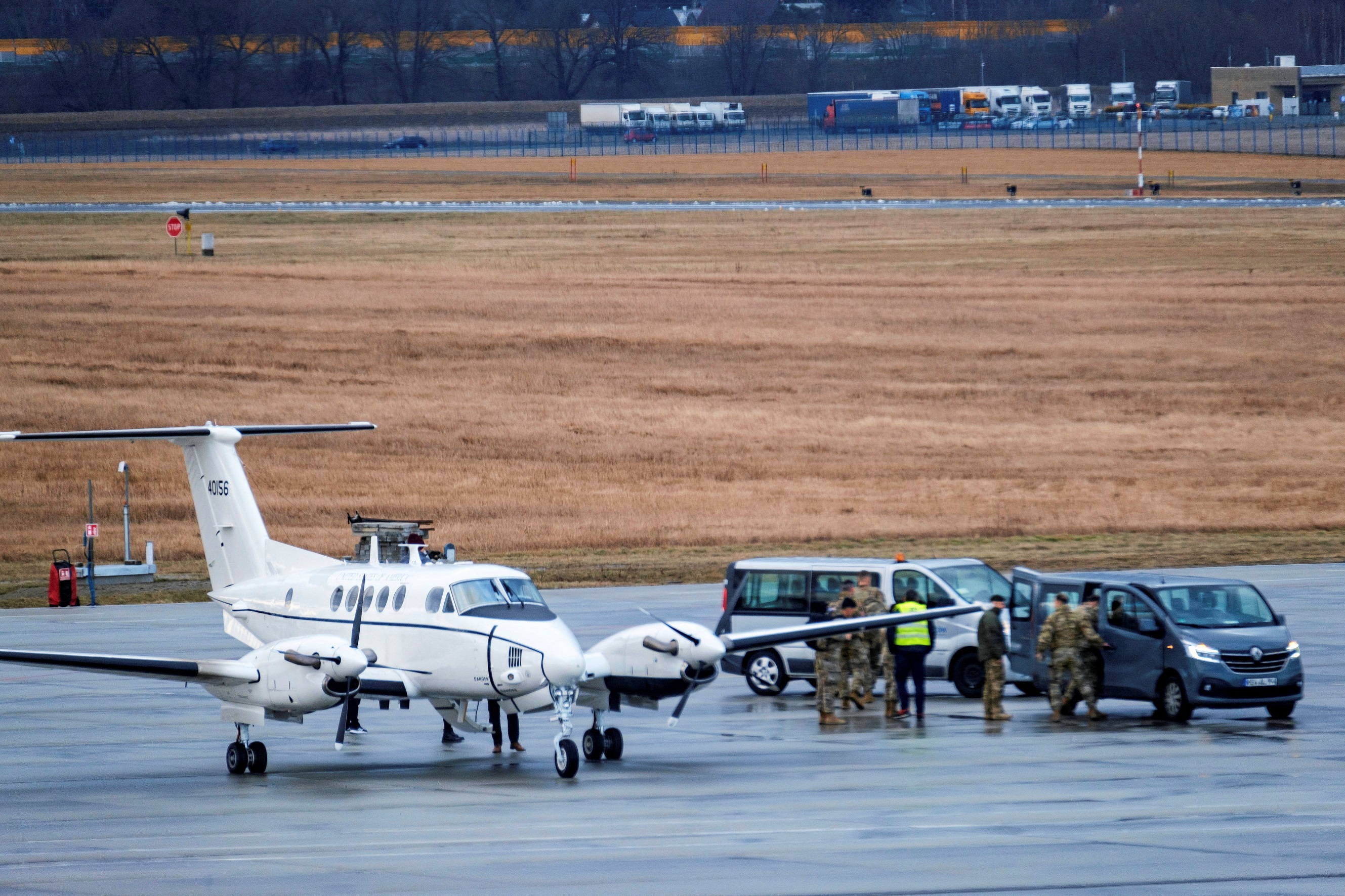 A small plane carrying what a Polish military source said were US chain of command personnel landed at Rzeszow-Jasionka airport as preparations continued at the base, which is near Poland's border with Ukraine.