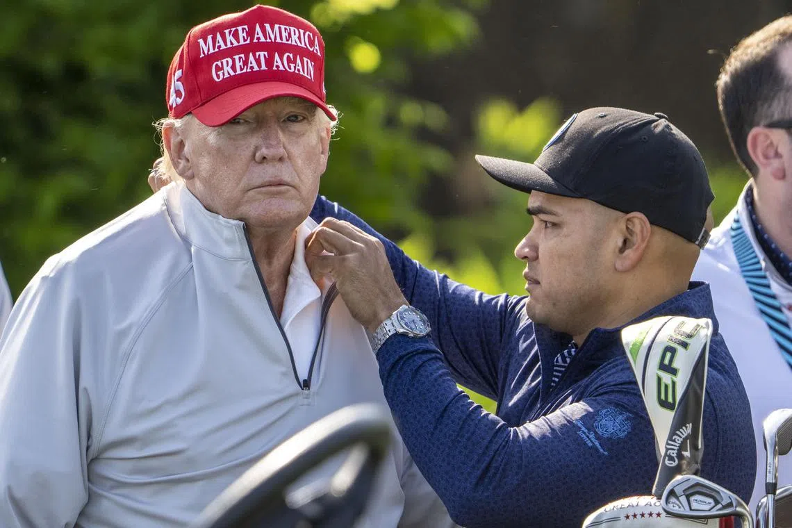 Trump’s personal aide, Walt Nauta , helping him with a shirt at a golf event in May 2023.