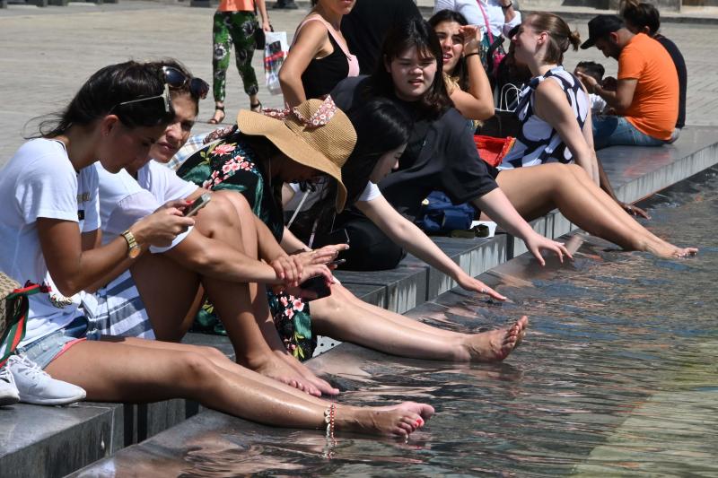 In a photo taken on June 26, 2019, tourists refresh themselves in a pond near the Louvre in Paris.