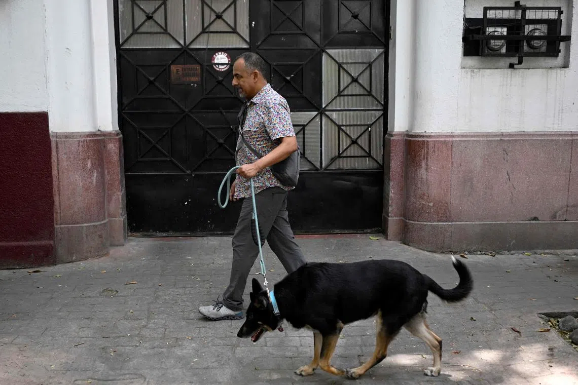 Mr Oscar Gomez walking his dog, Iggy, in Mexico City.