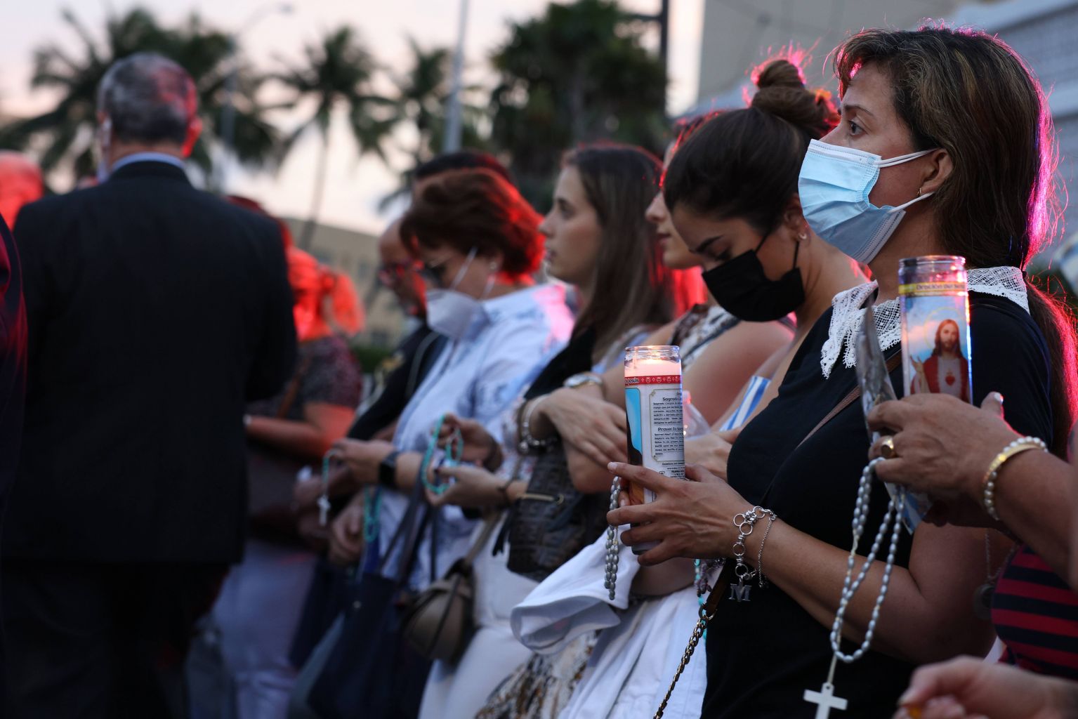 Priests and nuns carry a makeshift statue of Our Lady of Fatima past St Joseph Church in Miami Beach before walking to a vigil for victims, in Surfside, Florida.