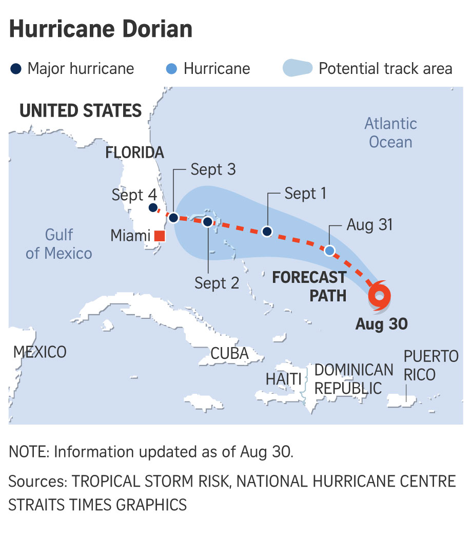 MIAMI (REUTERS) - Hurricane Dorian churned toward Florida with increasingly powerful winds and drenching rains on Friday (Aug 30), wreaking havoc on people's Labour Day weekend plans in one of America's biggest vacation destinations.