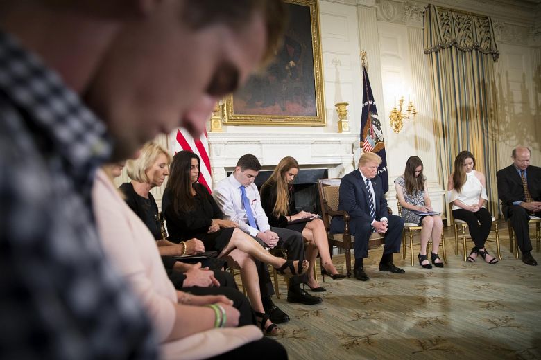 US President Donald Trump bows his head during a prayer before a discussion that included survivors of the Marjory Stoneman Douglas High School mass shooting, in the State Dining Room of the White House on Feb 21, 2018.