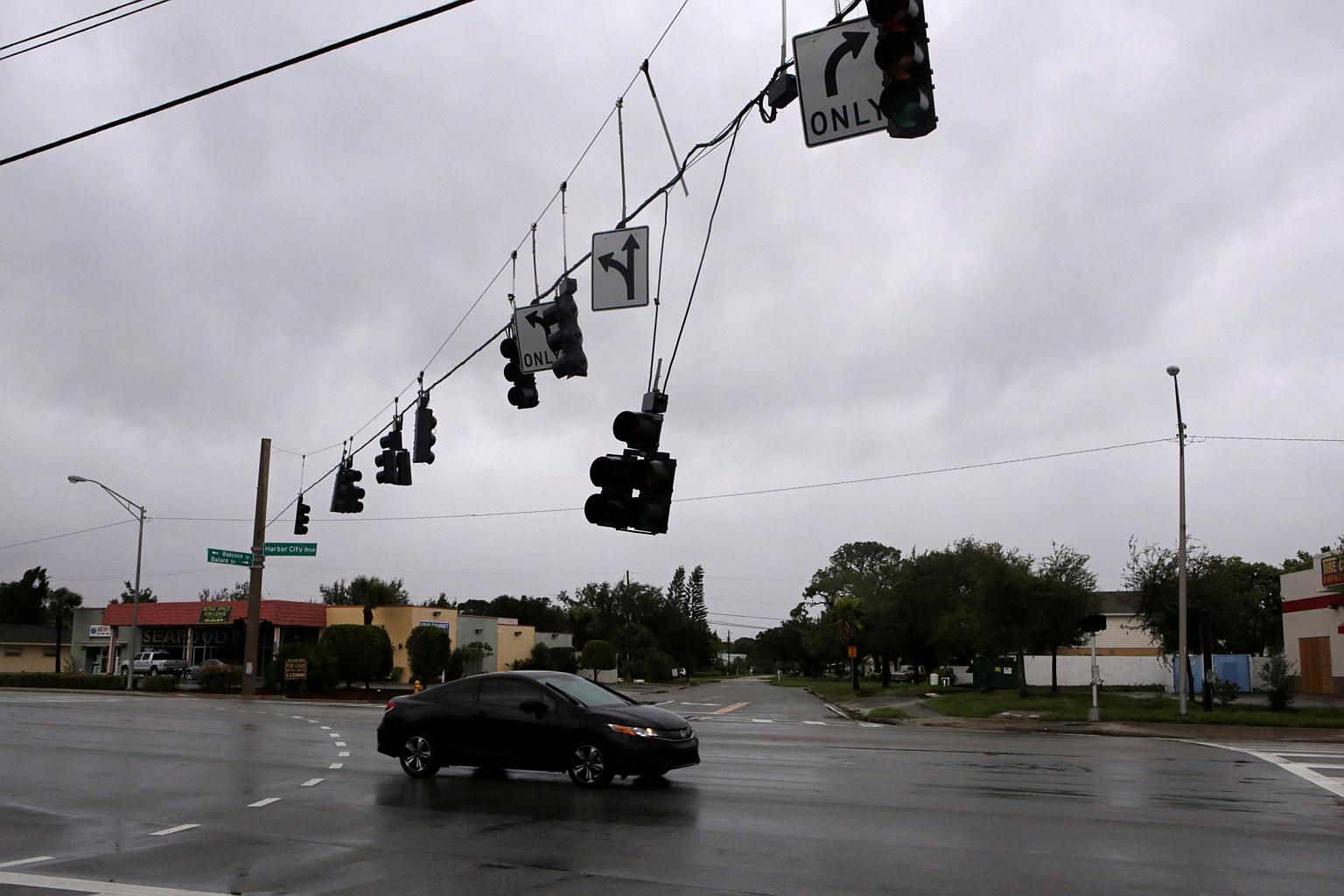 A traffic lamp damaged by wind is seen after Hurricane Matthew hits in Melbourne, Florida on Oct 7, 2016.