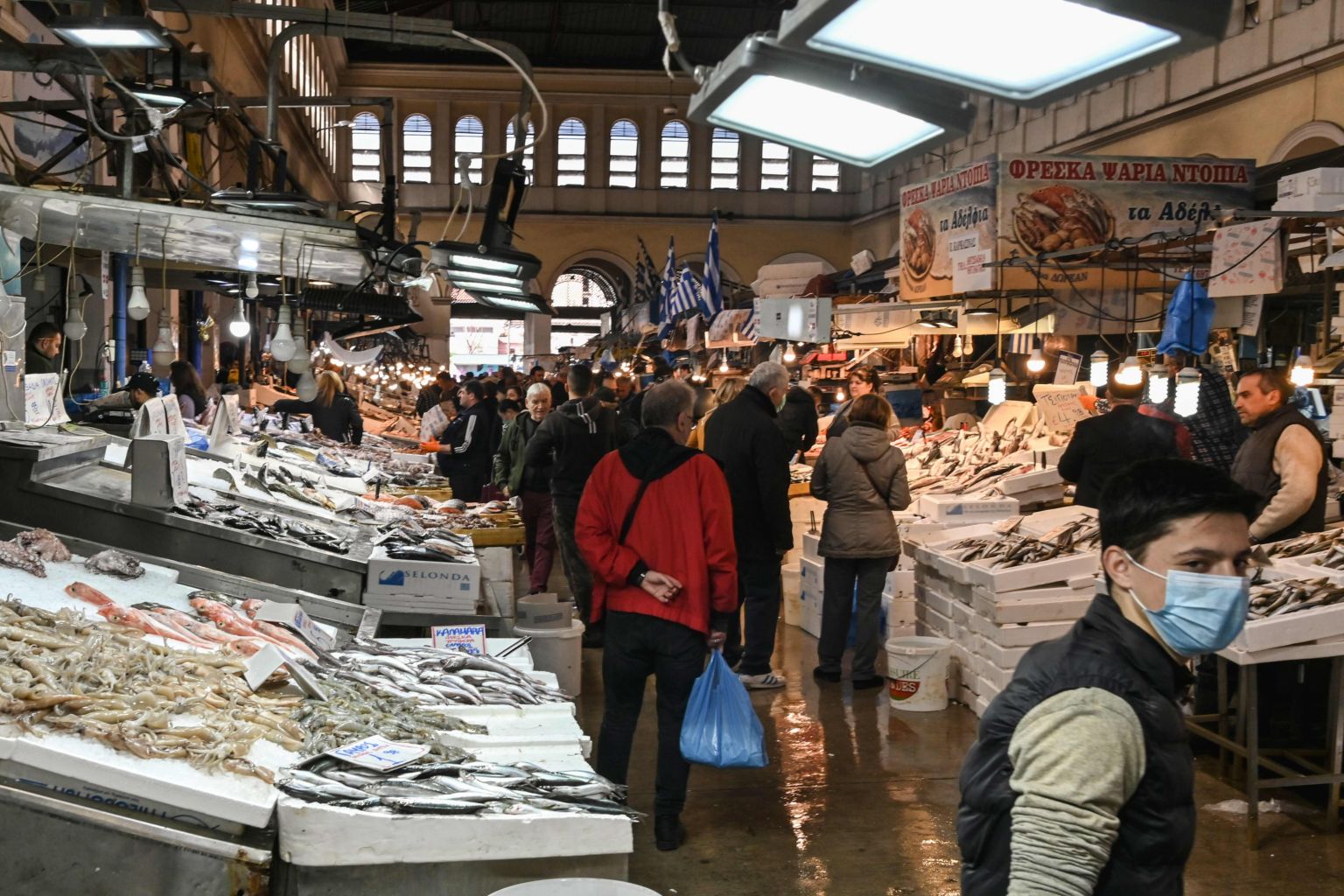 At a fish and meat market in central Athens, Greece, on March 14, 2020. So far there has been no major interruptions to food supplies.