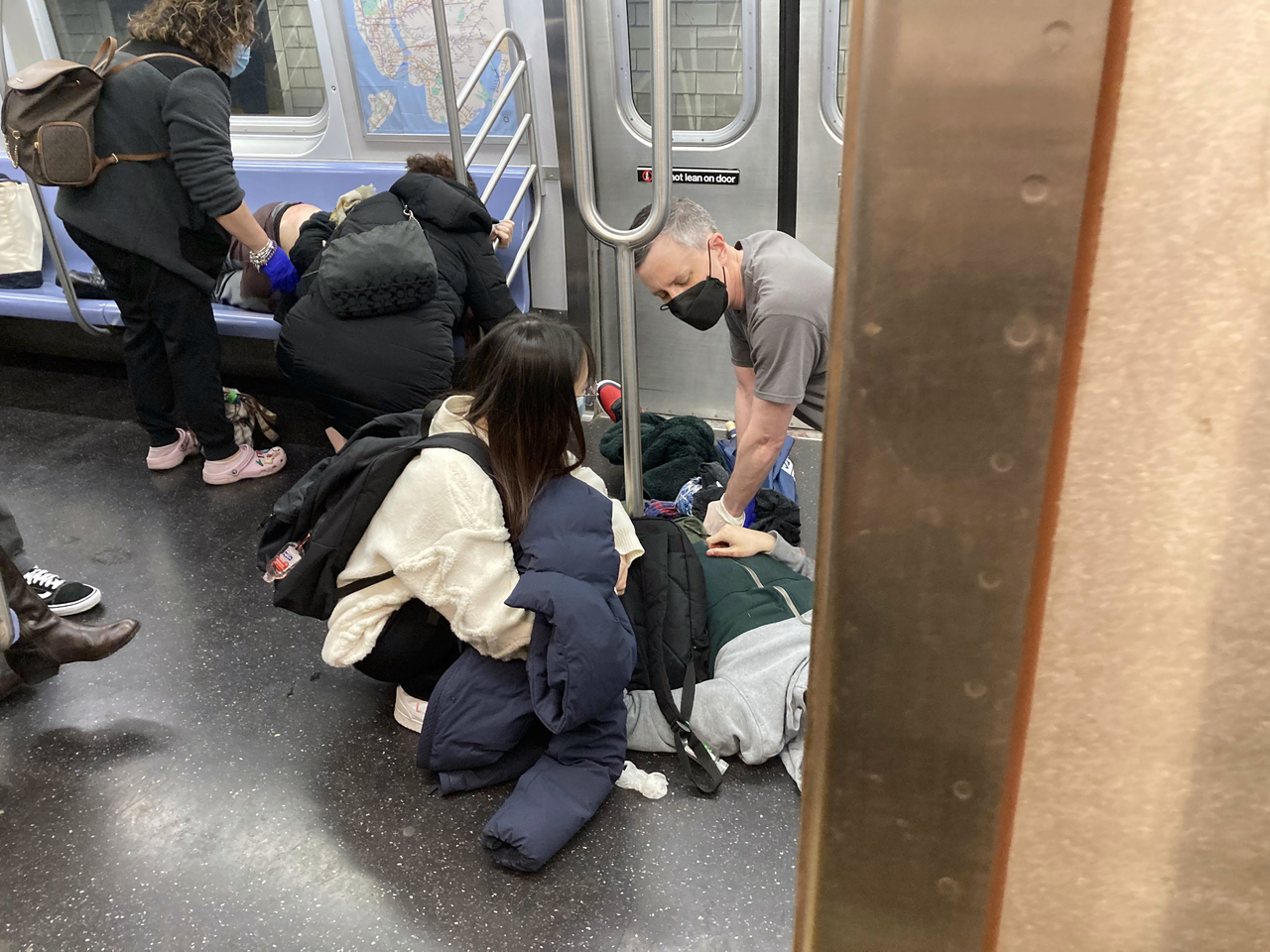 Wounded commuters receiving first aid after a shooting at a New York subway train on April 12, 2022.