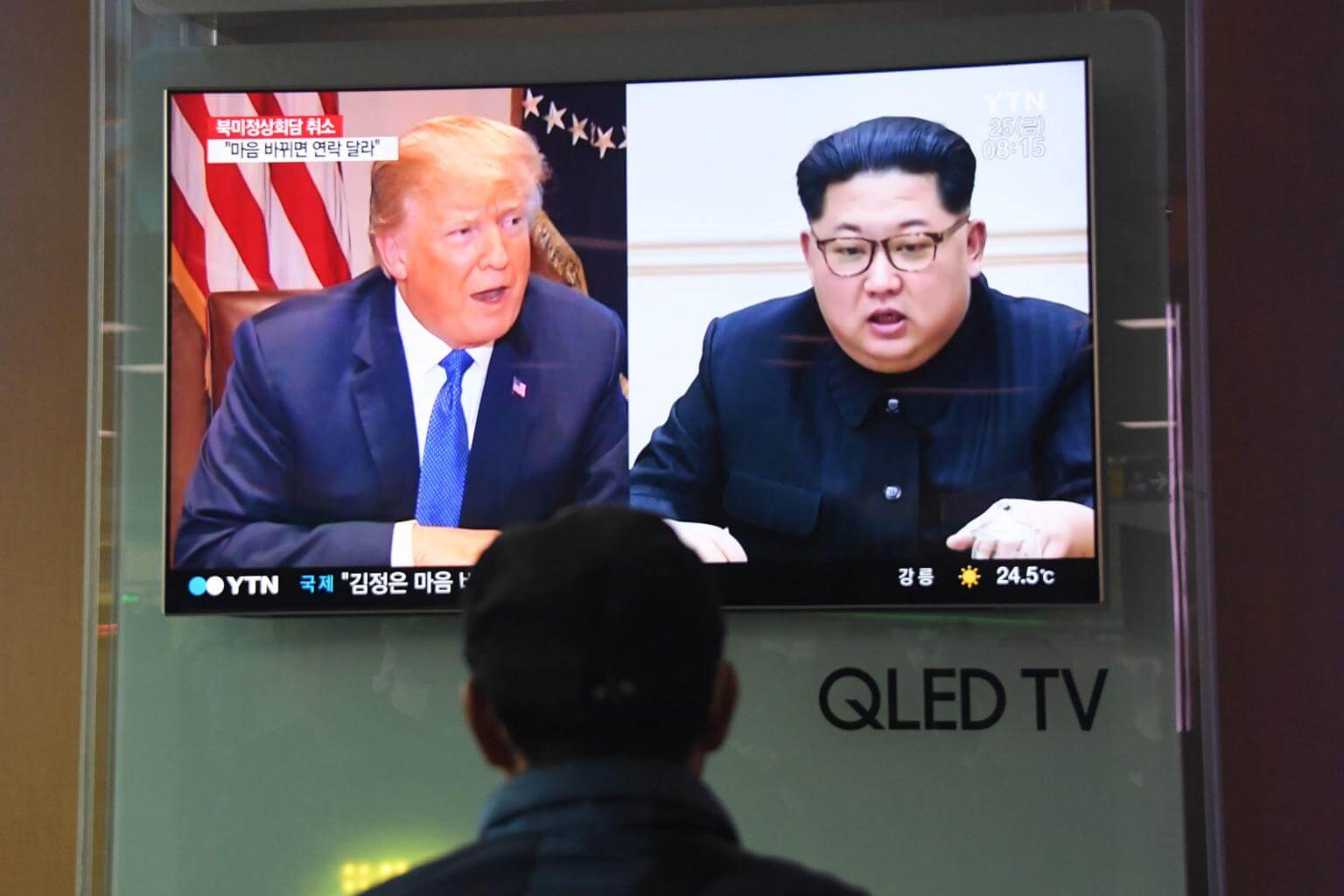 A TV news item showing North Korean leader Kim Jong Un and US President Donald Trump at a railway station in Seoul on May 25, 2018.