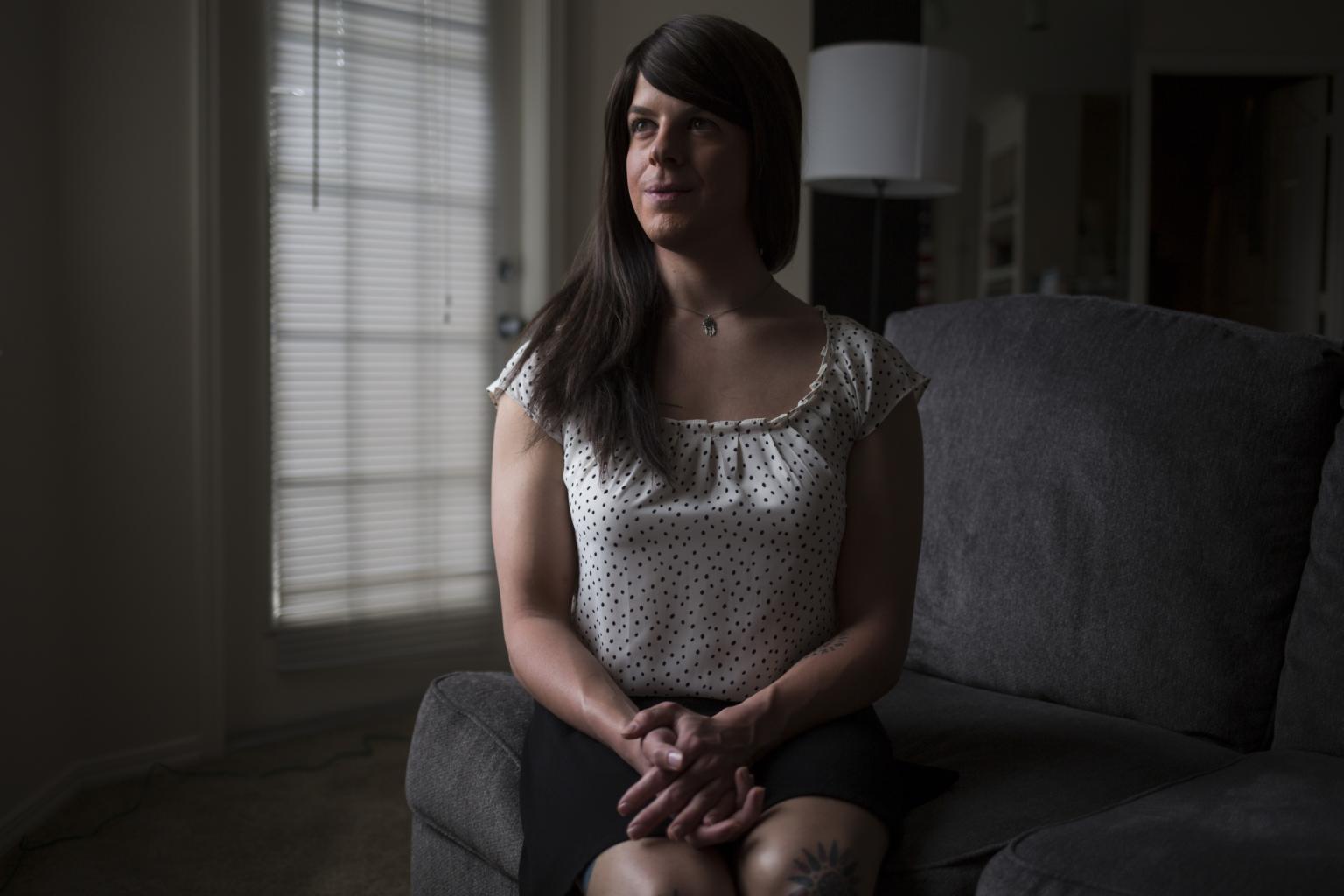Air Force Staff Sgt. Ashlee Bruce, who dresses as female at home but goes by her birth name, Matthew, at work, at home in Aurora, Colorado.
