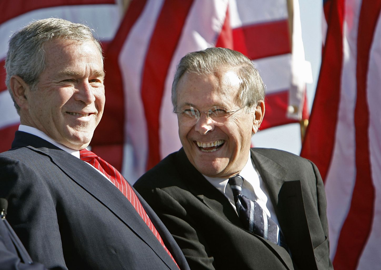 A 2006 photo shows US president George W. Bush (left) and defence secretary Donald Rumsfeld sharing a laugh during a dedication ceremony for the new US Air Force Memorial.