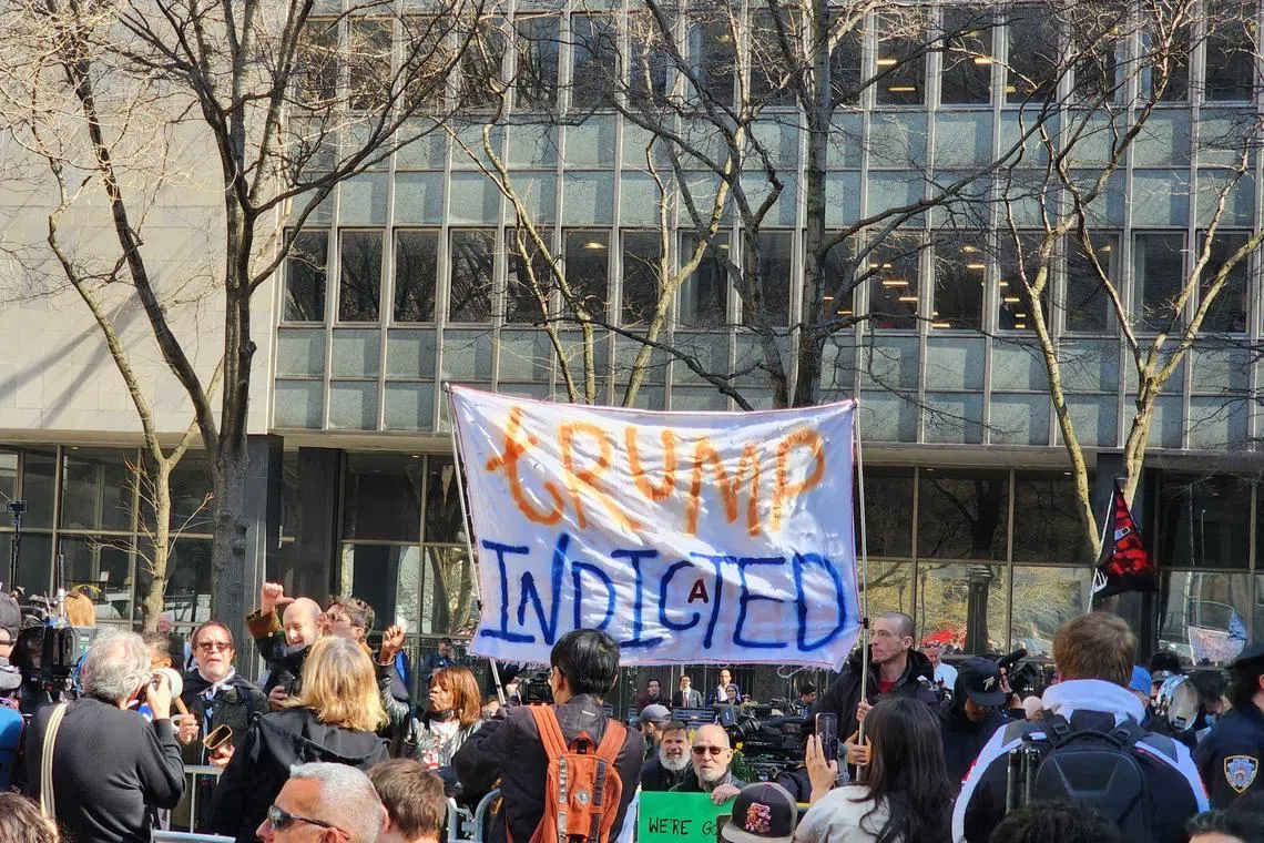 Among the pro- and anti-Trump protesters, one man – holding a sign saying “No one is above the law” and identifying himself as a retiree and human rights activist – said that “this first indictment will probably be good for Trump (politically)“.