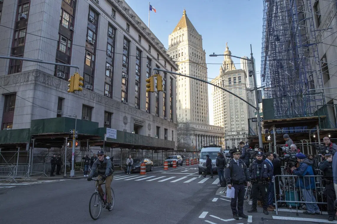 New York police guarding the press pen near the criminal court in Lower Manhattan on April 4.