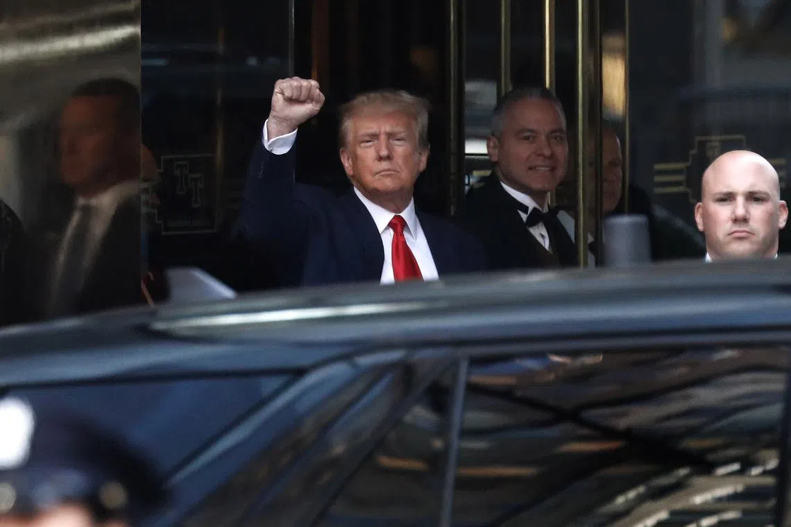 Donald Trump holding his fist in the air in a gesture to reporters as he leaves Trump Tower for the New York City Criminal Court on April 4, 2023.
