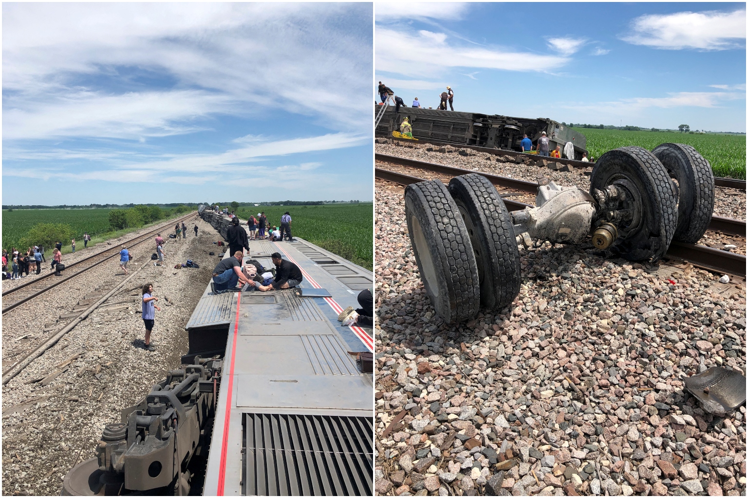 Eight cars and two locomotives derailed, Amtrak officials said, leaving all but one car lying on its side along the track surrounded by grass and farmland. Passengers evacuated the wreck through windows facing skyward.