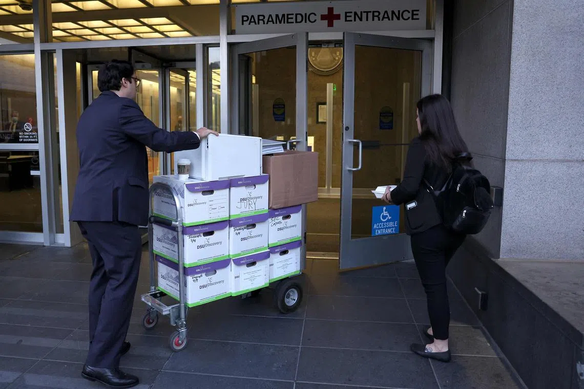 Documents for the shareholder trial against Tesla and Elon Musk arrive at the courthouse in San Francisco.