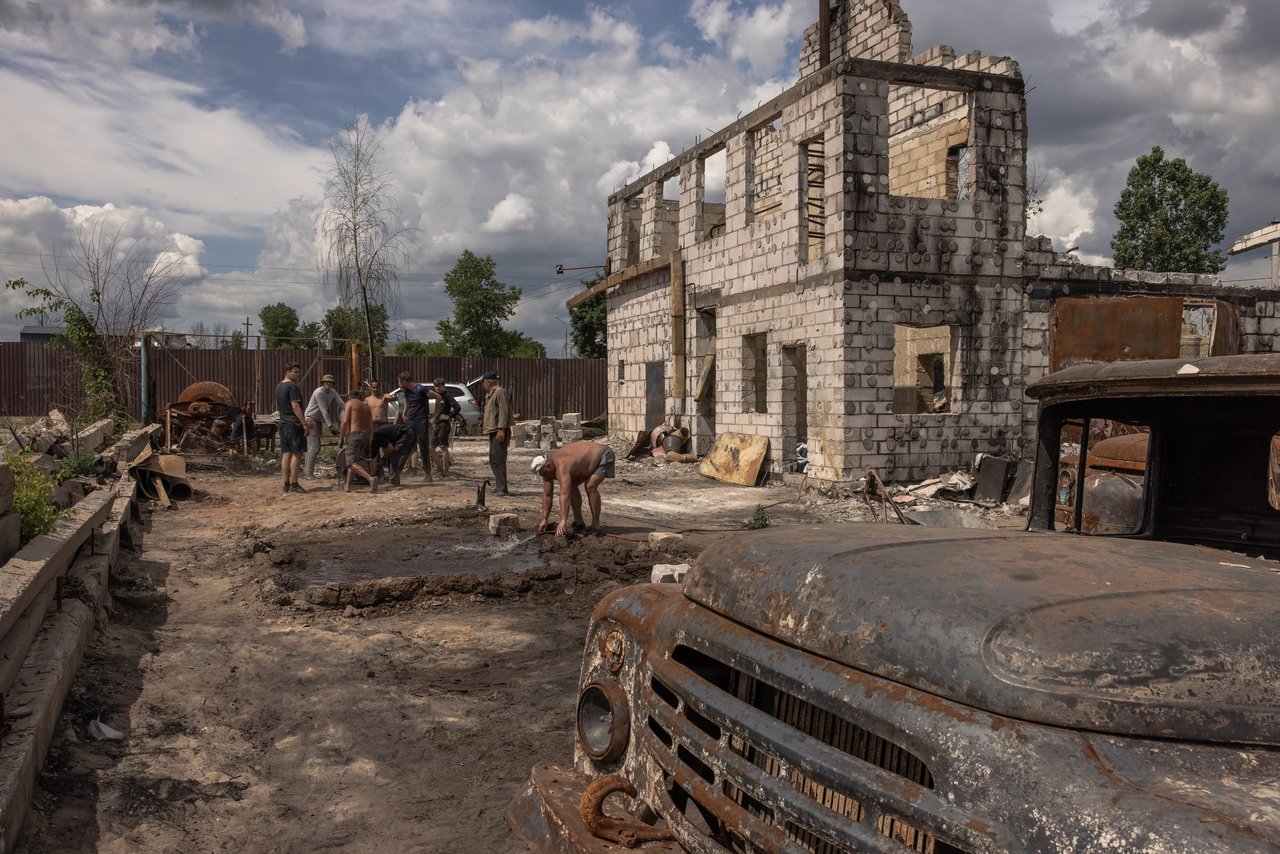 Workers and volunteers cleaning up the debris from a damaged factory in Horenka, in Ukraine's Kyiv region, on June 17, 2022.
