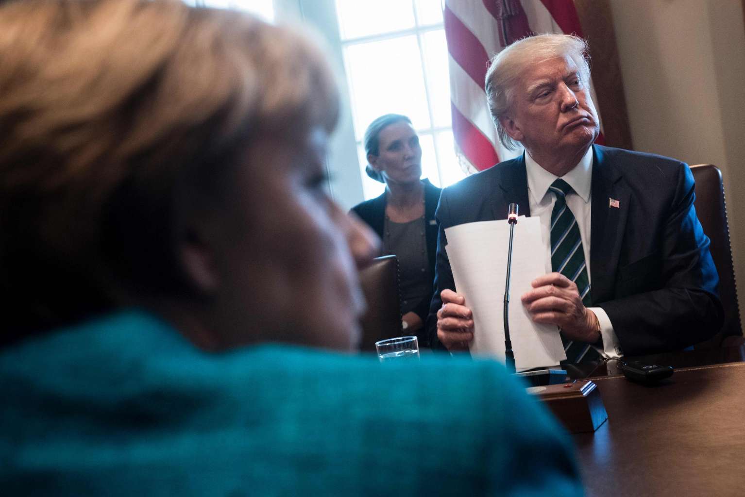 Germany's Chancellor Angela Merkel (left) and US President Donald Trump before a meeting with Germans and US business leaders in the Cabinet Room of the White House on March 17, 2017 in Washington, DC.