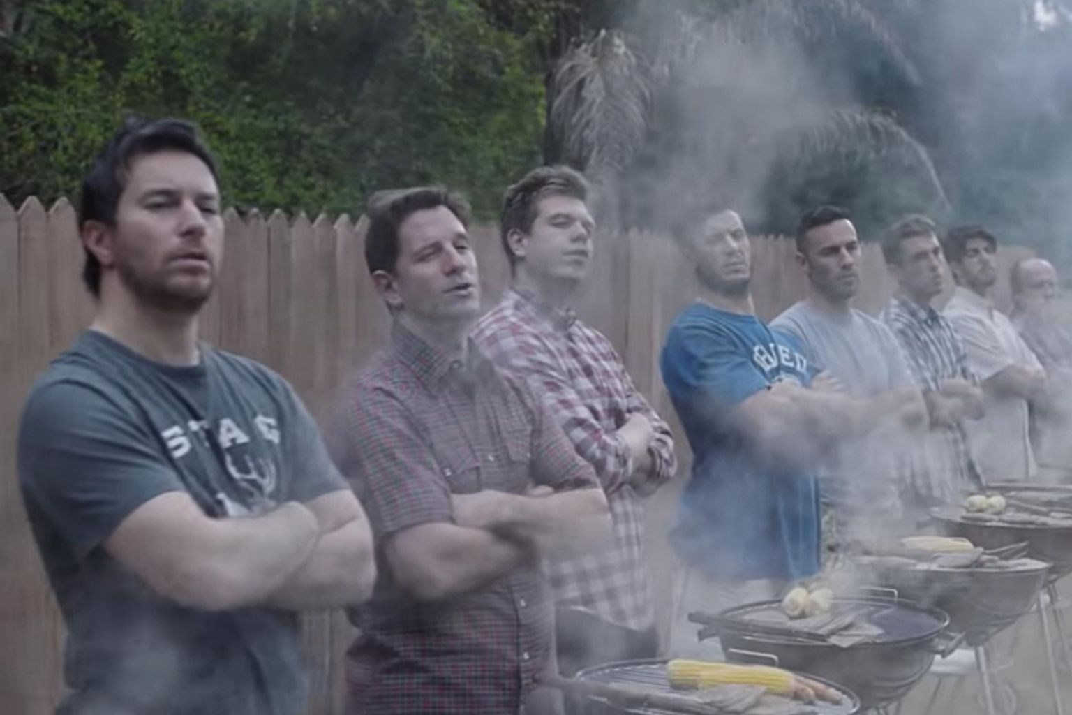A line of them, standing behind smoke wafting up from their grills, recites "boys will be boys will be boys will be boys".
