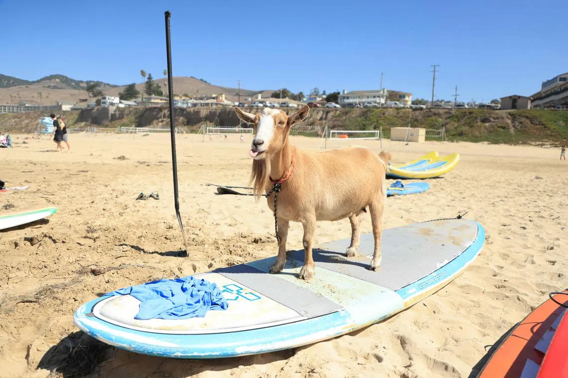 Surfing goat Grover stands on a board in Pismo Beach, California, on Aug 29.