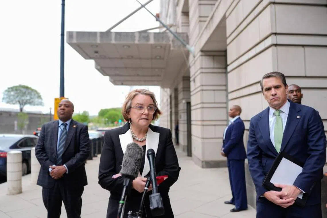 US Assistant Attorney-General for the Antitrust Division Abigail Slater and Deputy Attorney-General Todd Blanche speaking to members of the media outside the federal court in Washington.