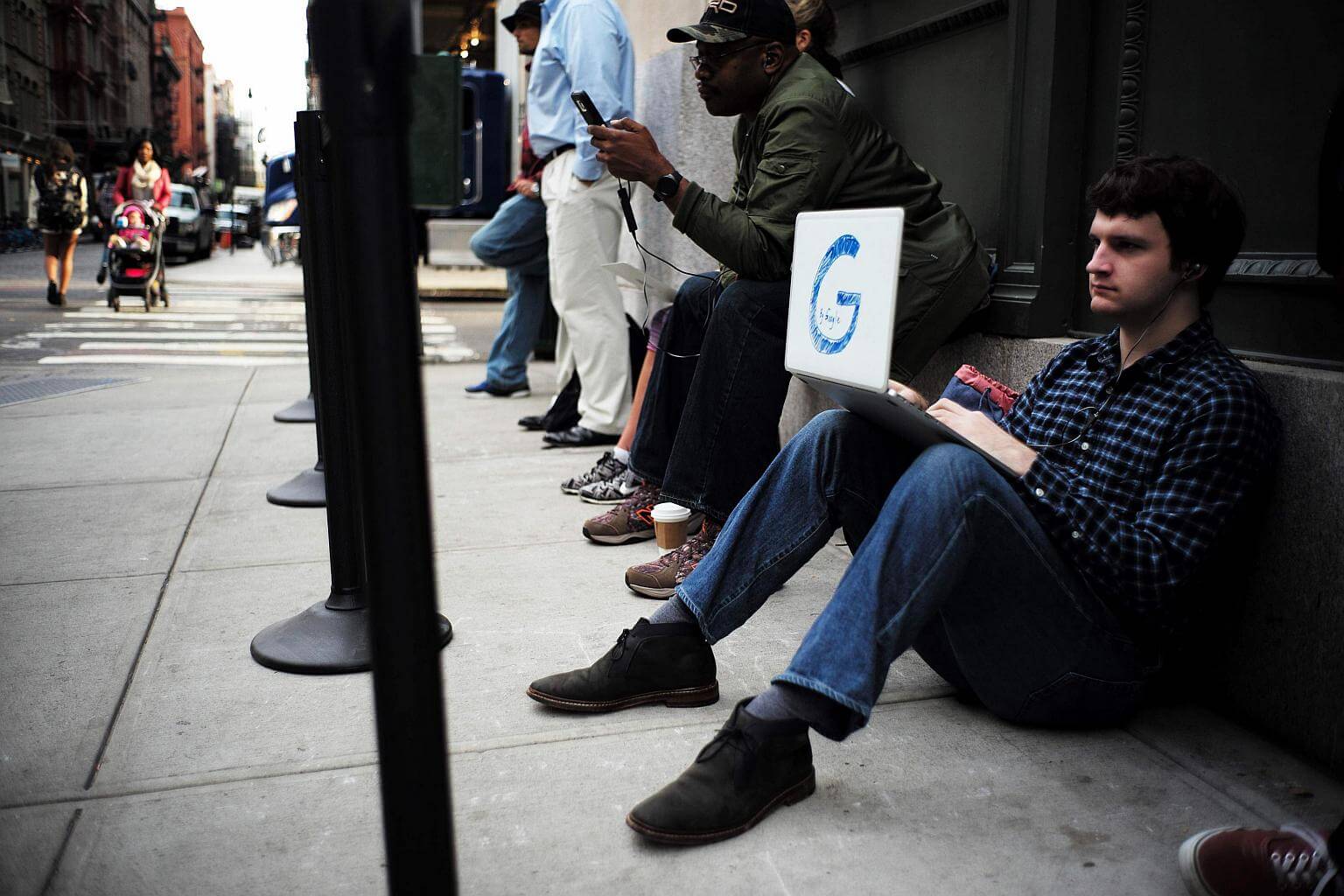 People wait outside for the opening of Google's pop-up store in New York on Oct 20, 2016.